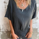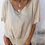 Anna tyylisi loistaa Ivalo-paidan avulla, joka yhdistää täydellisesti mukavuuden ja eleganssin. Tämä boho-henkinen paita on suunniteltu naisille, jotka arvostavat rentoa mutta silti tyylikästä ilmettä. Sen imarteleva V-kaula-aukko ja ilmava leikkaus luovat raikkaan ja naisellisen ilmeen, joka sopii niin aurinkoisille päiville kuin rentoihin hetkiin ystävien kanssa.