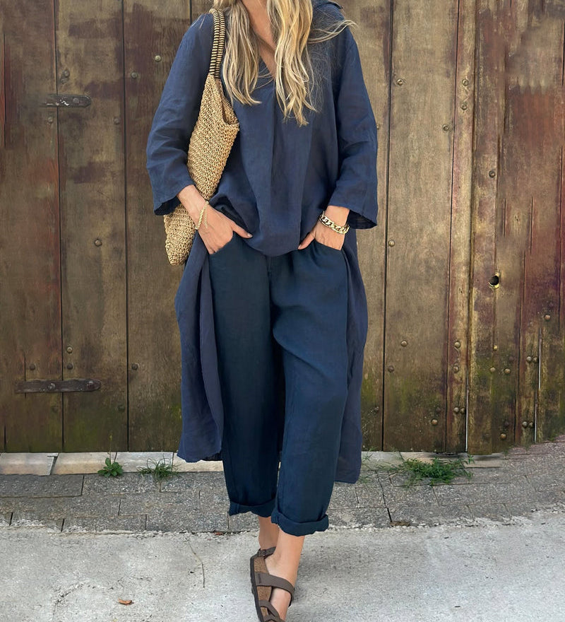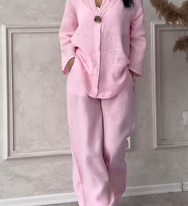 Kaksiosainen setti puuvillasta ja pellavasta, koristeltu rentoilla nappeilla