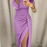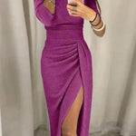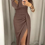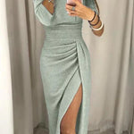 Olkaimeton malli korostaa kauniisti hartioitasi, kun taas pitkät hihat tuovat ripauksen salaperäisyyttä. Asymmetrinen halkio ja kynäleikkaus imartelevat vartaloasi, antaen sinulle itsevarmuutta ja tyyliä. Tämä mekko on enemmän kuin vain vaate; se on lupaus unohtumattomista hetkistä.