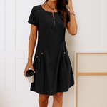Älykkäät yksityiskohdat, kuten leikkisä vetoketju kaula-aukossa, antavat mahdollisuuden muokata ilmettäsi helposti. Käytännölliset taskut lisäävät ripauksen rentoa tyyliä, ja suora leikkaus imartelee kaikkia vartalotyyppejä. Tämä mekko on enemmän kuin vain vaate – se on osa elämäntapaasi, joka yhdistää mukavuuden ja tyylin.