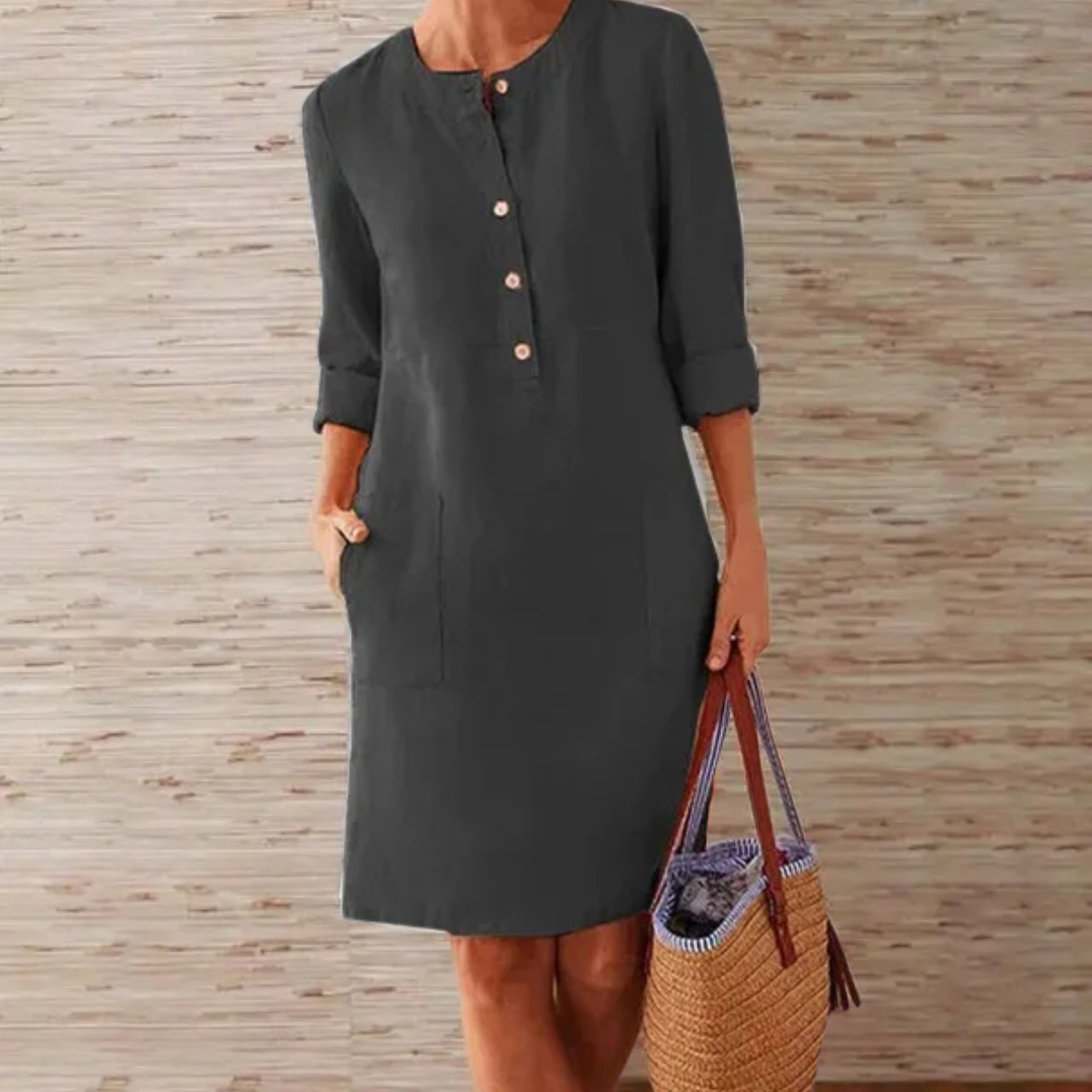 - Ajaton muotoilu – Pyöreä kaula-aukko ja hillitty polvipituus luovat klassisen, naisellisen ilmeen.
