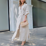 Hengittävä ja kesäinen, puhtaasta pellavasta valmistettu mekko on ideaalinen lämpimiin lämpötiloihin. Syvä V-pääntie luo elegantin siluetin, joka antaa jokaiselle ilmeelle erityisen lisän. Pitkä, löysä istuvuus takaa sulavan ilmeen ilman liikkuvuuden rajoittamista, joten voit nauttia kesäpäivistä täysin rinnoin.