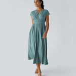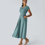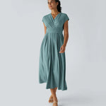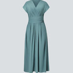Kaunis midimekko on enemmän kuin vain vaate – se on osa elämäntyyliäsi. Sen ilmava ja hengittävä kangas pitää sinut viileänä kuumina päivinä, ja sen tyylikäs V-pääntie sekä lyhyet hihat tuovat esiin naisellisuutesi. Tämä mekko mukautuu saumattomasti päivääsi, olitpa sitten kotona tai liikkeellä.