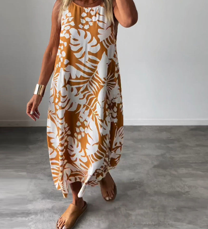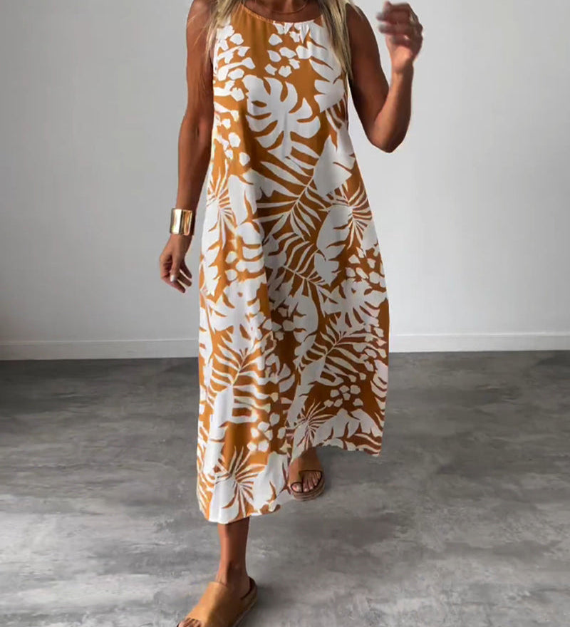 Kukka | Tyylikäs olkaimeton mekko lehtiprintillä