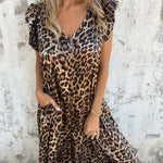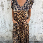 Itsevarmuus alkaa upeasta asusta, ja tämä haalari on juuri se, mitä tarvitset. Sen elegantti leopardikuvio ja syvä V-pääntie luovat voimakkaan, naisellisen ilmeen, joka herättää huomiota. Rento maxi-malli laskeutuu pehmeästi keholla, korostaen siluettiasi oikeissa kohdissa. Käytännölliset sivutaskut lisäävät käytännöllisyyttä ilman, että tyylistä tingitään.