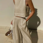 Tutustu tyylikkään kaksiosaisen setin viehätysvoimaan, joka yhdistää maksimaalisen mukavuuden ja modernin muotoilun. Tämä setti on täydellinen valinta jokaiselle naiselle, joka arvostaa rentoa mutta samalla eleganttia ilmettä. Ilmanhiha crop-top ja väljät housut tarjoavat erinomaisen yhdistelmän tyyliä ja mukavuutta, joka tekee jokaisesta päivästä erityisen.